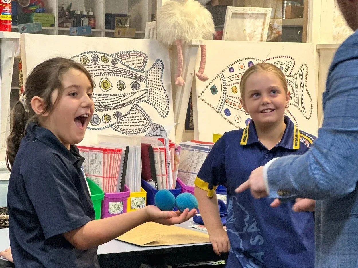 Following the show, students take part in a hands-on workshop where they explore self-working magic tricks grounded in mathematical concepts like logic, pattern recognition, and categorisation.